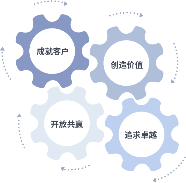 成就客户是一切决策的出发点,,,创造价值是衡量所有工作的标准,,追求卓越是我们做事做人的态度,,开放共赢是我们的格局也是最终的结果。。价值观的齿轮环环相扣,,,,推动着组织里的每个人不断向前。。。